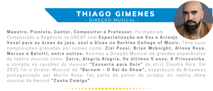 Pensando nos sonhos dos atores e o mercado que cada vez mais cresce, a Escola de Atores Wolf Maya decidiu realizar sua nona edição do “Making Musical” com grandes profissionais desse cenário: Kleber Montanheiro (Diretor Artístico) que dirigiu musicais como “O Canto de Ninguém”(2020) com Lucas Papp e Fabi Bang, “Carmem, A Grande Pequena Notável”(2019) com Amanda Acosta, “Alô Alô Theatro Musical Brazileiro”(2017) e “Opera do Malandro”(2014); Thiago Gimenes (Diretor Musical) já esteve a frente de musicais como “O Rei do Show Barnum” (2021), “Conserto Para Dois”(2019 – 2021), estrelada por Claudia Raia e Jarbas Homem de Mello e “Os Últimos 5 Anos”(2018); e Keila Fuke (Coreografia) esteve em “Carmem – A Grande Pequena Notavel” dirigido por Kleber Montanheiro (2019), “Zorro” (2010) e “Vingança” (2014). Confira o currículo completo dos professores abaixo.