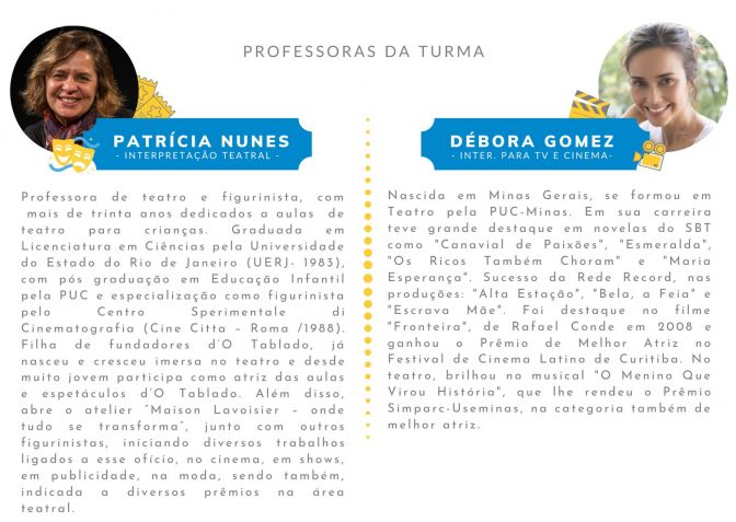 De forma prática por meio do ensino Online via webconferência – através da plataforma Zoom – as aulas introduzem noções de técnicas de interpretação para os palcos e telinhas, em 16 encontros, no qual nossas crianças e adolescentes irão estudar, praticar e apresentar cenas, para os professores. Assim os futuros atores mirins irão desenvolver a sua criatividade e expertise cênica de forma lúdica e dinâmica. Confira: