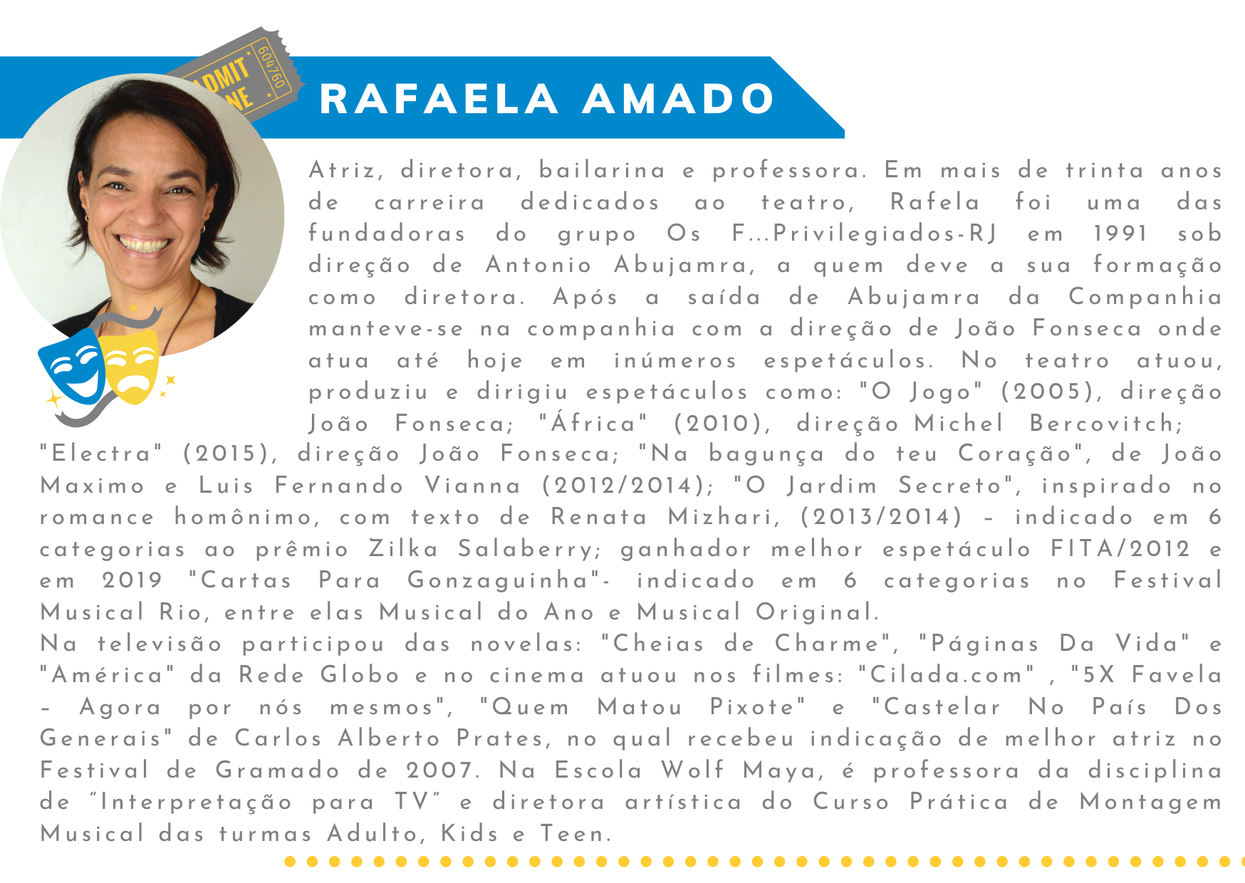 A experiência de estar em cartaz com outros alunos/atores é uma grande oportunidade para desenvolver o autoconhecimento, a consciência corporal e vocal, estimular a criatividade e o trabalho em equipe, além de técnicas de memorização de texto e marcas. Aqui o aluno ganha experiência de palco, de contracena e se desenvolve como ator/atriz, passando por todas as etapas de um ator profissional diante de uma montagem profssional com temporada de 3 fins de semana em Dezembro no Teatro Nathalia Timberg – Sala Nathalinha, sob direção de Rafaela Amado, diretora dos espetáculos “Cartas para Gonzaguinha”, “Rent” e “Despertar da Primavera”. Confira o currículo completo da diretora abaixo: